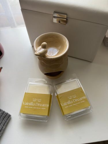 Este pack incluye un quemador decorativo combinado con tabletas de cera aromática (wax melts) de vainilla, pensadas para liberar su aroma de manera progresiva al calentarse, sin humo y sin mecha.